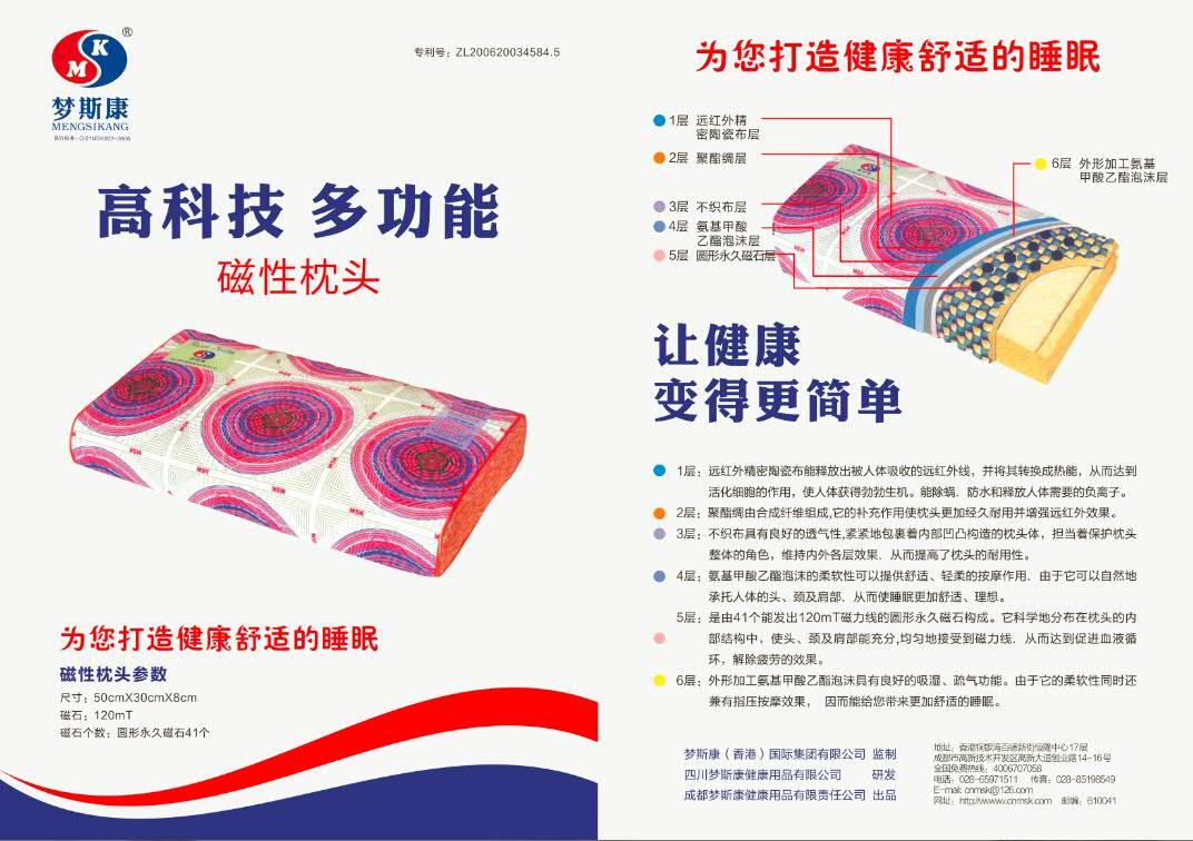 2、主要功能介绍: (1)高科技磁石:磁力线切割人体血液,产生血液起电力,发生物理变化和化学变化: a、物理变化:长链变短链,大分子团变小分子团。 b、化学变化:使血液里面胆碱酯酶、胰蛋白酶、ATP、SOD等酶的活性增强,加快新陈代谢和细胞活性化,增强机体免疫力。 (2)远红外精密陶瓷布:能释放对人身体非常有益得远红外线,提高人体细胞的活性化,使人身体获得勃勃生机和活力,同时具有除螨、拒油、防水的功效。